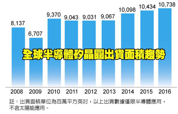 依據國際半導體產業協會(SEMI)旗下硅晶圓制造者部門SMG(Silicon Manufacturers Group)公布的年終硅晶圓產業分析報告顯示,2016年全球半導體硅晶圓出貨總面積達10,738百萬平方英吋,年成長率達3%,連續3年創下出貨量歷史記錄新高。