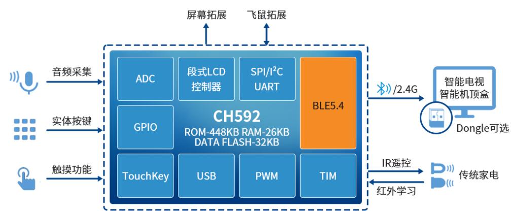 本方案基于沁恒CH592低功耗藍牙MCU,支持藍牙、2.4G和IR紅外遙控模式。遙控器可與電視機、機頂盒直連,也可通過配套的藍牙/2.4G Dongle建立連接。