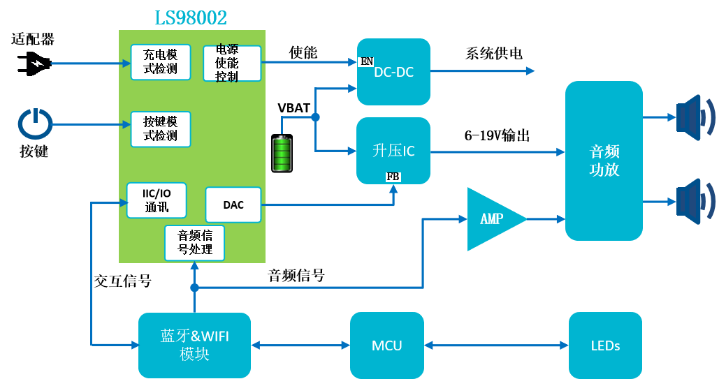 現場可重構IC、通用可配置的模數混合芯片內部集成豐富的模擬資源和數字資源,可輕松替代電路中的各種標準器件,并按照客戶要求組合成最優小型ASIC,縮短開發周期,降低成本。下面介紹LS98002現場可重構CPLD芯片應用案例—藍牙音箱。